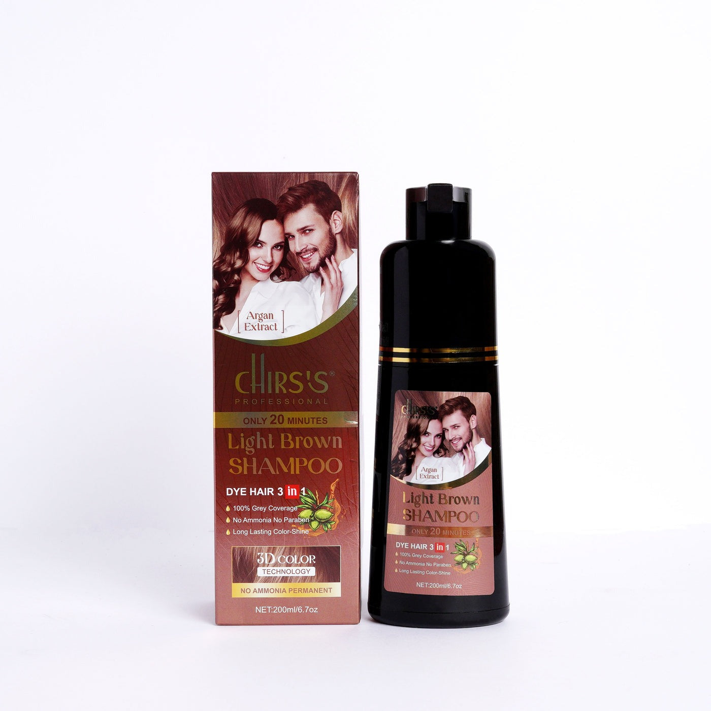 "Chris's Professional Hair Color Shampoo with Argan Extract" in the shade "Light Brown" is a hair care product designed to both color and cleanse the hair. Here's a possible description: